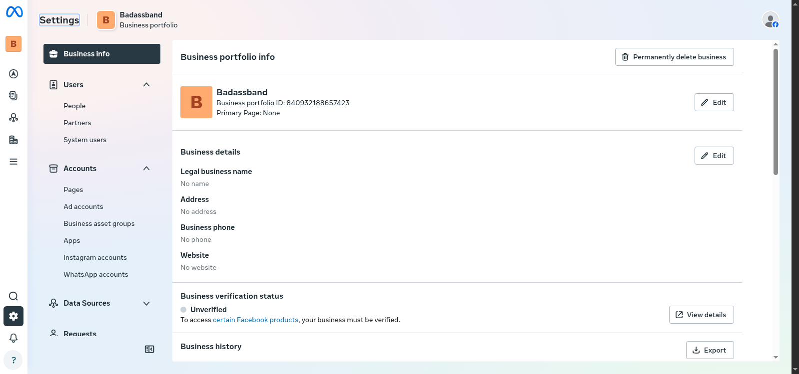 Iremos deparar com a página inicial do meta business e poderemos verificar o portfolio empresarial no menu lateral da direita e logo apos acessamos as configurações