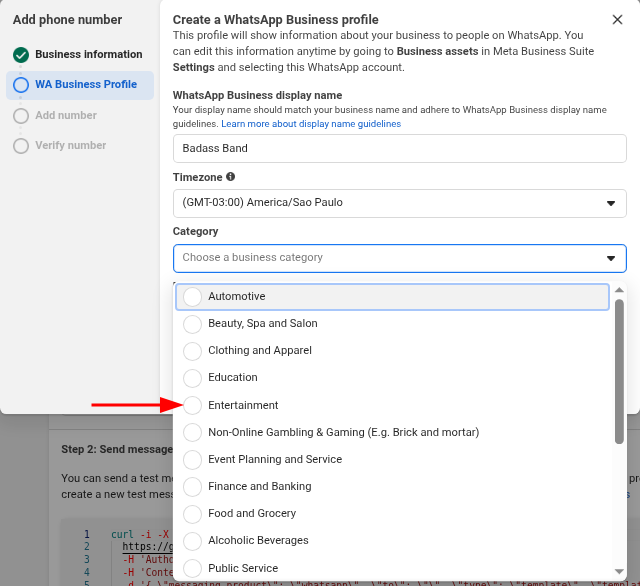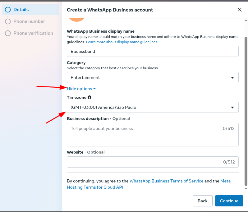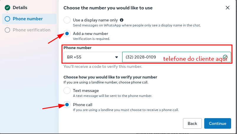 Após isso clique em continue nessa parte iremos adicionar o número do whatsapp que irá receber a API da seguinte forma