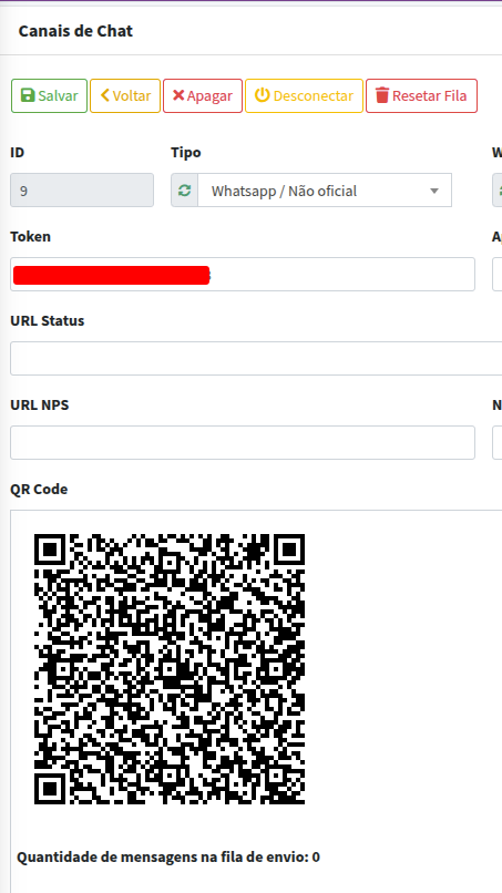 Verifique também a quantidade de mensagens na fila antes de conectar, se tiver muitas, clique em "Resetar fila". Este procedimento é necessário para não disparar várias mensagens de uma vez.