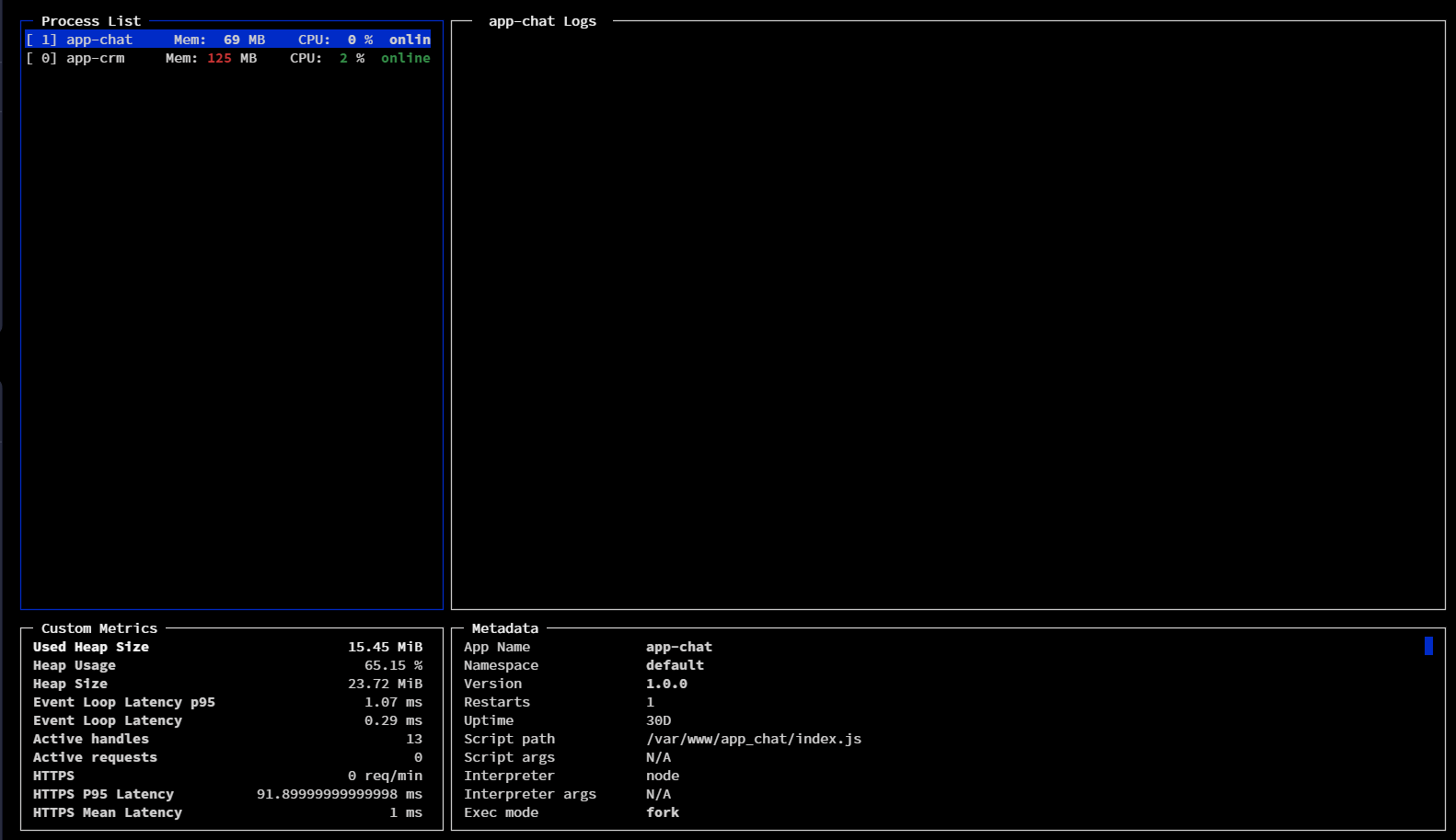 pm2 monit —-----> Para listar em tempo real o consumo de recursos dos processos rodando através do PM2