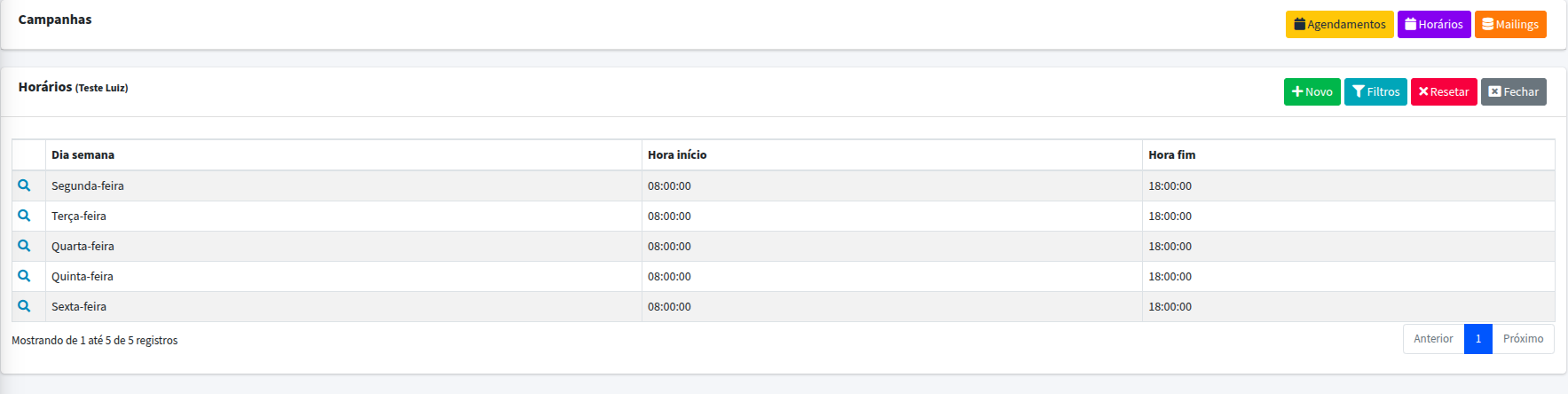 Pode ser feita a alteração dos horários daquela campanha, clicando na lupa de cada dia. Porém, só será alterado o horário daquela campanha, não de outras já criadas ou que ainda serão criadas.