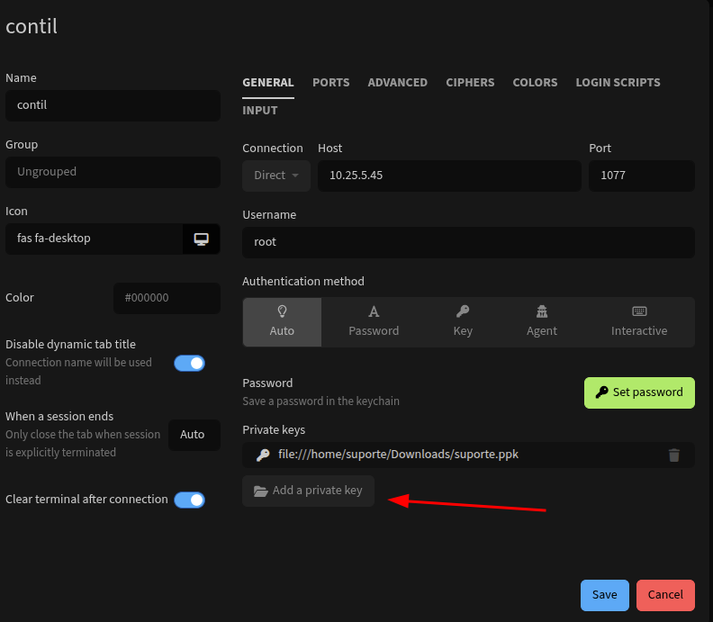 Você deve adicionar a key do suporte suporte.ppk para fazer a autenticação. Não esqueça de usar a vpn para fazer o túnel com o servidor.
