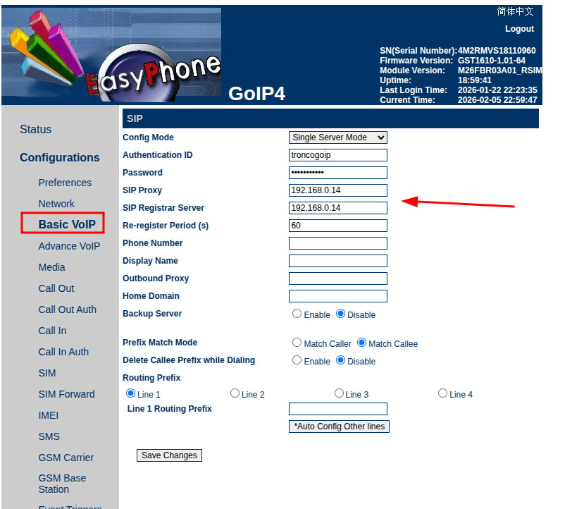 Você terá que usar um login e senha para desbloquear a página do goip. É padrão:
